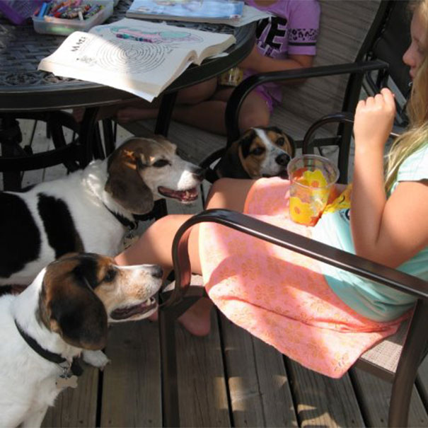 The 3 Grand Forks, N. Dakota beagles. MMMMM, begging works? The grand kids sure give them.....