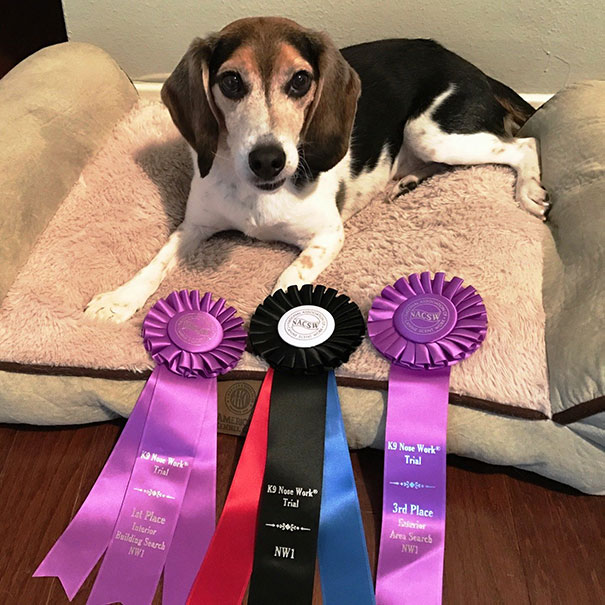 Hi Frieda, I'm writing to brag on Bentley my now 6 year old Branko's Beagle. We starting taking classes in canine scent work 2 years ago. I had to take some time off for having two knee replacements last year. This past weekend, Bentley and I competed for the first time in a National Association of Canine Scent work trial in Austin, Texas. In order to earn a NoseWork 1 Title, the dog must pass four searches all in the same day (interior, exterior, vehicles and containers). I'm so proud to report that Bentley earned his NW1 title AND he placed 1st in interiors (7.9 seconds) and 3rd in exteriors (8.5 seconds) out of 46 dogs competing. I've attached a picture of my cute little guy. Also in the process of purchasing videos taken this weekend. I'll send those when I have them. Hope all is well with you. As always -- thank you for placing this little guy with me. He is such a joy. D. g. TEXAS