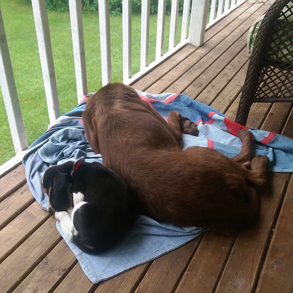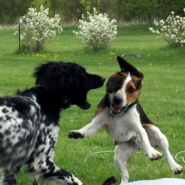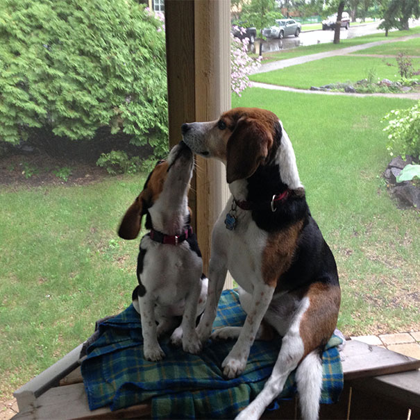 "Boy, I used to do this in my wild days!" Young dog teaches old dog tricks.