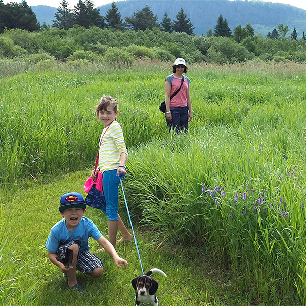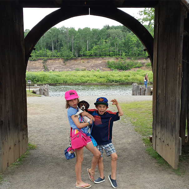 Trixster, pups with his new owners, including little owner, in P.E.I.
