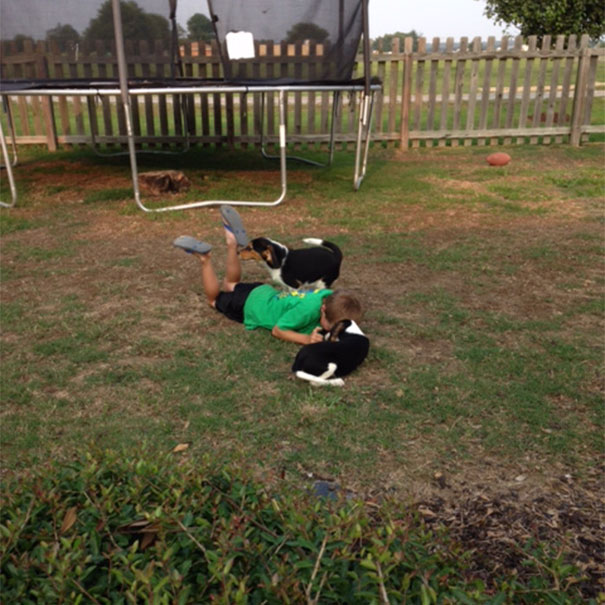 I was playing around snapping photos with a new lens and got a few of Hunter snuggled in a ball between my son's legs. Hunter seems to have taken up with both of them and welcomed them to the pack.