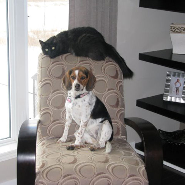 Hi Frieda, Here is a picture of Mo and Tuxley curled up together on the couch.