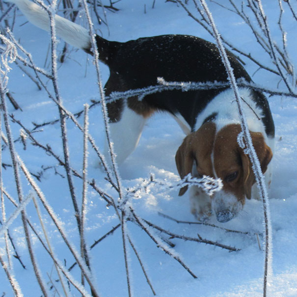 Branko’s Snowshoe Tracker. 13 inch female, Branko’s Blue Betty x Ft.Ch. Branko’s Jimmy D. She’ll never see the trials. But, she’ll be hunter under..... a raptor/hawk. She lives in Northern Ontario. Her owner had another dog from us, used the same way.