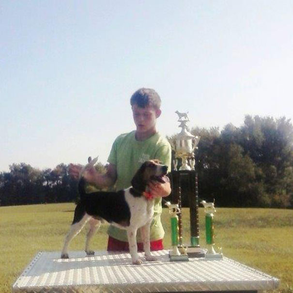 Auggie with her owner Helen, in a non-hunting rather tracking/obedience event. Auggie and Helen have a superior partnership, showing beagles can do anything asked of them, when handled right.