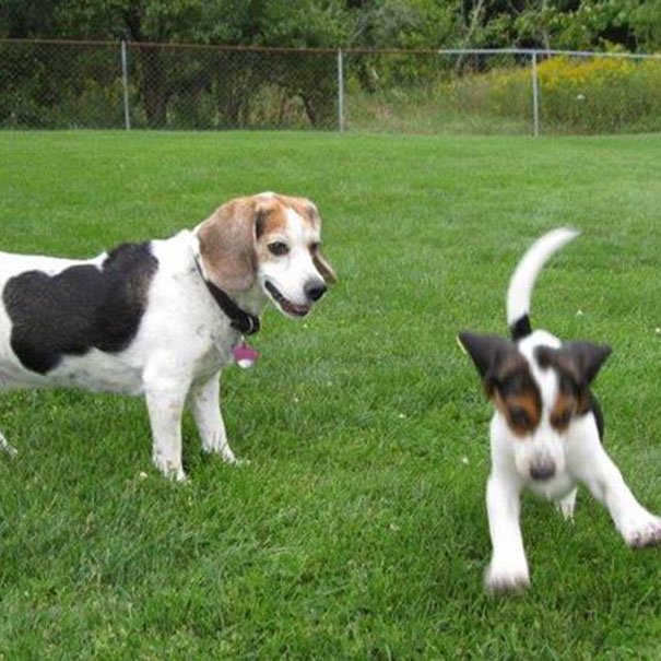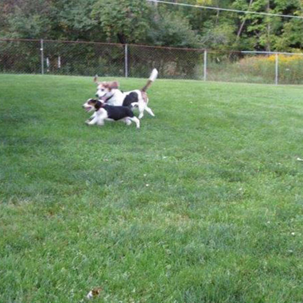 Hunter (Charmaine X One Tuff Ombre) and Cody (pup by Go Go Girl and Doc Watson) have a good time with Cody's new owners. This is their 4th beagle they have had from us over the years, and we couldn't wish for a better home for the hounds.